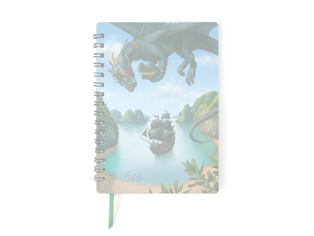 Praktický dračí diář na rok 2024 pro ty, kteří si stejně jako já stále rádi píší poznámky ručně. Diář je kompletně v češtině a má mou ilustraci „The Golden Bay“ s dračim pirátem na přední straně obálky. Má formát A6 (105 × 148 mm) se zakulacenými rohy pro větší odolnost, černou kroužkovou vazbu a zelenou záložkovou stuhu. Obálka je chráněná lesklým laminem a poslední stranu tvoří pevný karton.