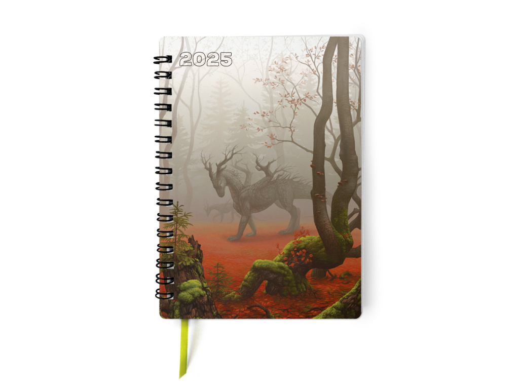 Praktický dračí diář na rok 2025 pro ty, kteří si stejně jako já stále rádi píší poznámky ručně. Diář je kompletně v češtině a má mou ilustraci „Mysterious Forest“ s lesními draky na přední straně obálky. Má formát A6 (105 × 148 mm) se zakulacenými rohy pro větší odolnost, černou kroužkovou vazbu a žlutozelenou záložkovou stuhu. Obálka je chráněná lesklým laminem a poslední stranu tvoří pevný karton.