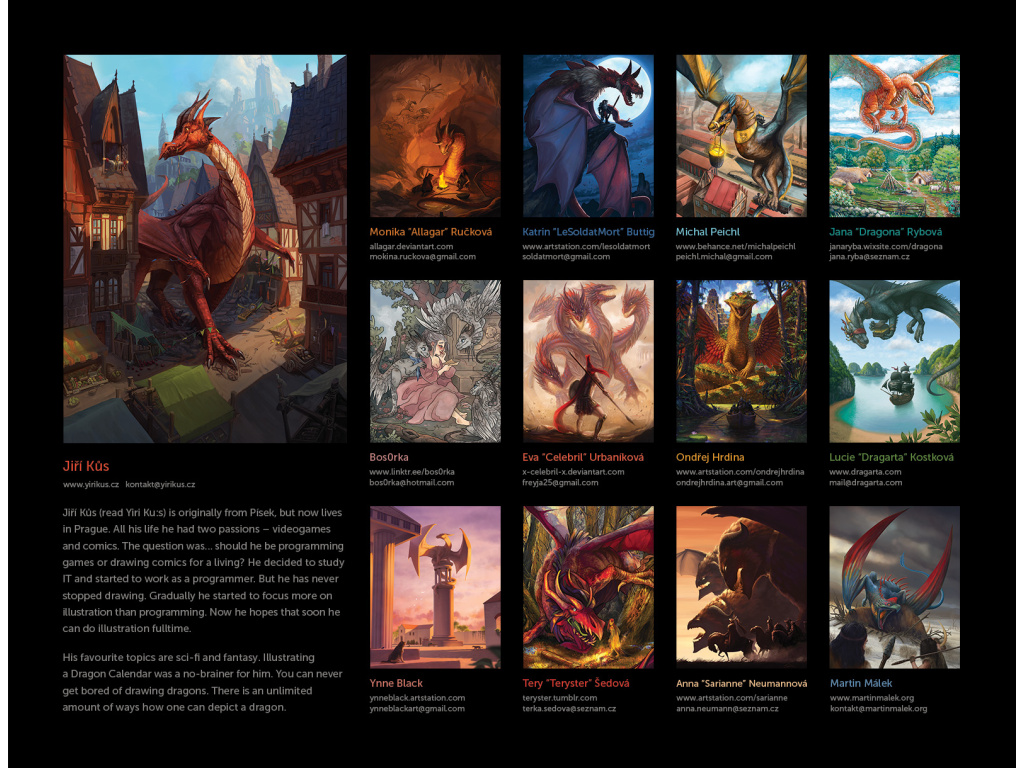 Dragon Calendar: DRAGONS 2020 is a collection of fantasy illustrations with dragons from 13 authors from the Czech Republic and Slovakia. Anybody who can paint and love fantasy can join our project. From all the submitted artworks we choose by vote those most beautiful and publish them in the calendar. This year’s theme is “Dragons in the History of Mankind”, so you will find a lot of great ideas from the alternative history of our world. And you do not even have to say goodbye to your most favourite illustrations at the end of the year – simply cut them along the black edges to create up to 13 beautiful images of 297 × 370 mm, which you can also frame.