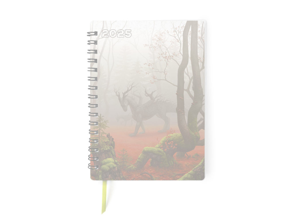 Practical dragon diary for 2025 for those who like me still prefer to write notes by hand. The diary is completely in Czech and has my illustration "Mysterious Forest" with forest dragons on the front cover. It has A6 format (105 × 148 mm) with rounded corners for greater durability, black ring binding and yellow-green bookmark ribbon. The cover is protected with glossy laminate and the last page is made of strong cardboard.