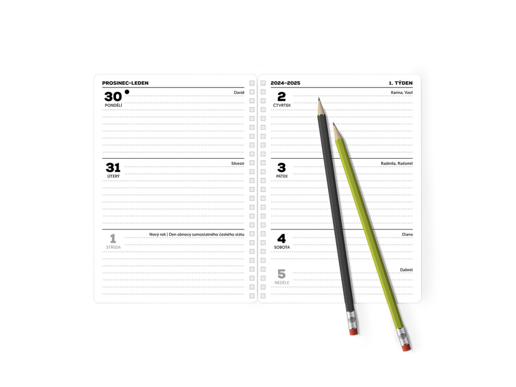 - Diary for 2025 containing name and other Czech holidays, week number and phases of the moon