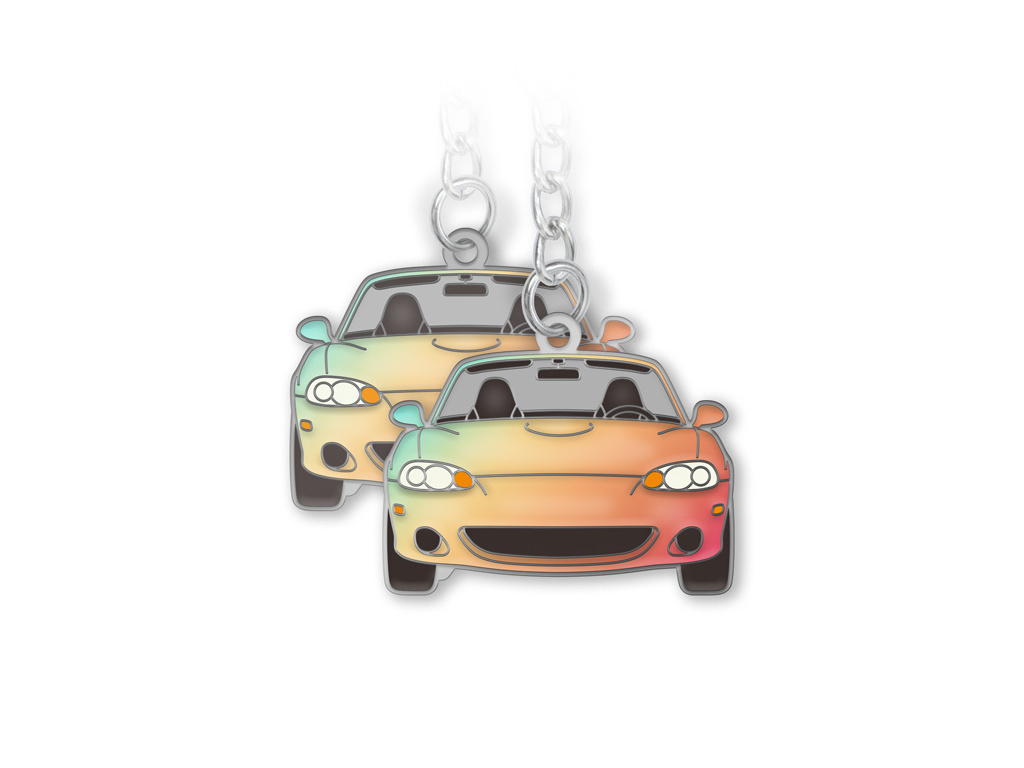 Kovová, oboustranná klíčenka s populárním roadsterem od Mazdy. Druhá generace MX-5 NB neboli „Miata“ nyní v libovolném odstínu laku dle Vašeho přání. Můžete si tak sladit své klíčenky s autem, i když nemáte původní, tovární odstín. Jednoduše si vylaďte svou barvu pomocí online nástroje a číslo Pantone barvy spolu s jejím slovním popisem dopište do poznámky ve 3. kroku objednávky. Minimální odběr jsou 2 kusy.