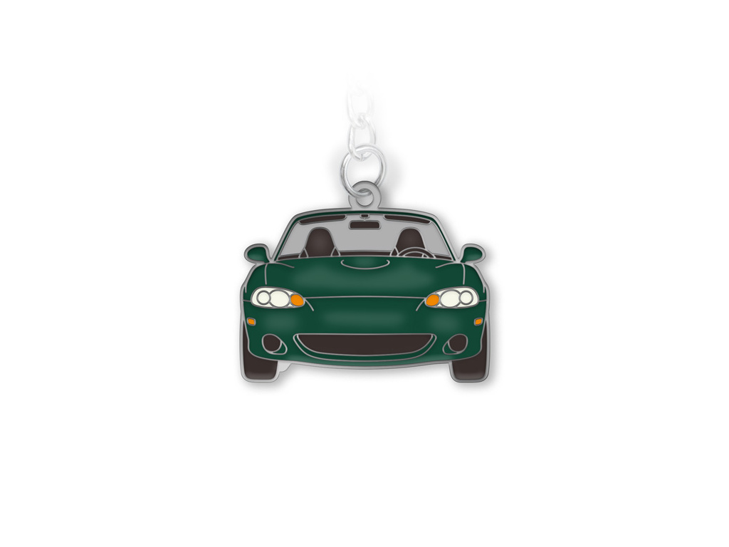 Kovová, oboustranná klíčenka s populárním roadsterem od Mazdy. Druhá generace MX-5 NB neboli „Miata“ v zeleném laku Emerald Mica (podobném také British Racing Green nebo Nordic Green Mica). Přívěšek je vyrobený z pevného kovu barvy niklu, s vystouplými liniemi, jejichž plochy jsou ručně vyplněné smaltovými barvami. Světla a registrační značka Miaty jsou z fluorescenční barvy a po nasvícení svítí ve tmě. Klíčenku si můžete připnout na klíče od auta nebo ji použít jako přívěšek na batoh, penál a spoustu dalších předmětů, které si chcete ozvláštnit.