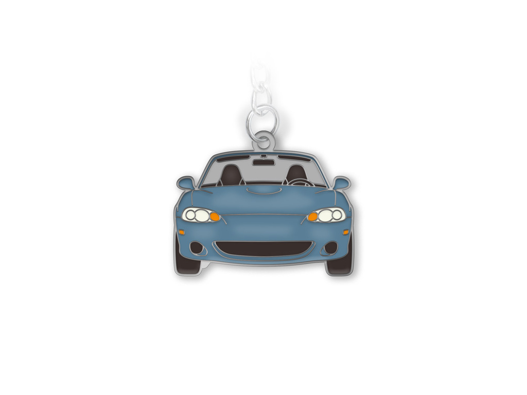 Kovová, oboustranná klíčenka s populárním roadsterem od Mazdy. Druhá generace MX-5 NB neboli „Miata“ v šedomodrém laku Razor Blue Metallic. Přívěšek je vyrobený z pevného kovu barvy niklu, s vystouplými liniemi, jejichž plochy jsou ručně vyplněné smaltovými barvami. Světla a registrační značka Miaty jsou z fluorescenční barvy a po nasvícení svítí ve tmě. Klíčenku si můžete připnout na klíče od auta nebo ji použít jako přívěšek na batoh, penál a spoustu dalších předmětů, které si chcete ozvláštnit.