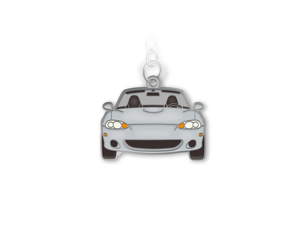 Kovová, oboustranná klíčenka s populárním roadsterem od Mazdy. Druhá generace MX-5 NB neboli „Miata“ ve stříbrném laku Sunlight Silver Metallic (podobném také Highlight Silver Metallic, Racing Silver nebo Cerrion Silver Metallic). Přívěšek je vyrobený z pevného kovu barvy niklu, s vystouplými liniemi, jejichž plochy jsou ručně vyplněné smaltovými barvami. Světla a registrační značka Miaty jsou z fluorescenční barvy a po nasvícení svítí ve tmě. Klíčenku si můžete připnout na klíče od auta nebo ji použít jako přívěšek na batoh, penál a spoustu dalších předmětů, které si chcete ozvláštnit.
