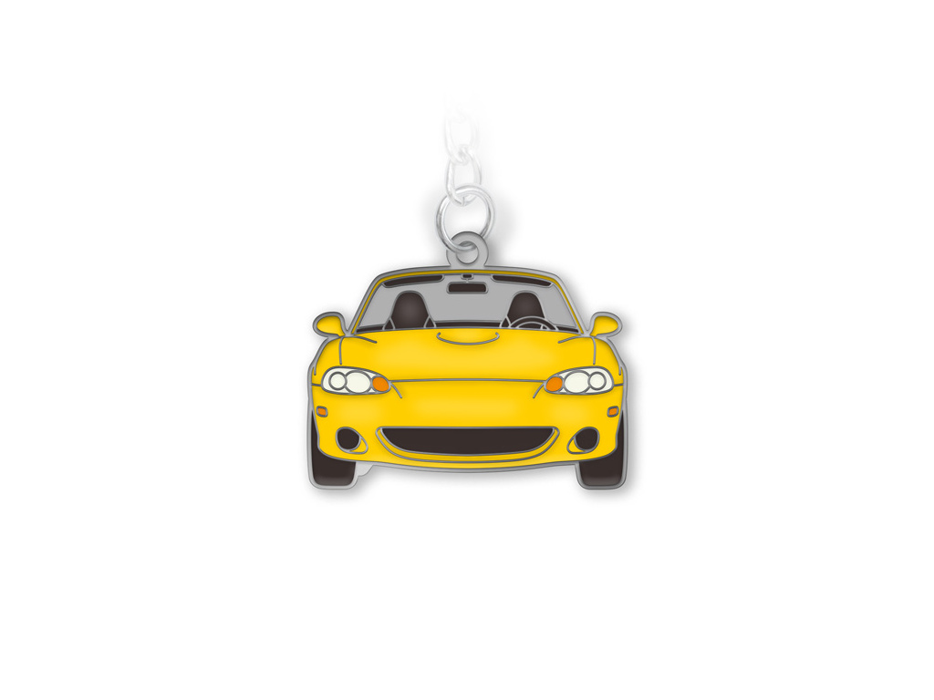 Kovová, oboustranná klíčenka s populárním roadsterem od Mazdy. Druhá generace MX-5 NB neboli „Miata“ ve žlutém laku Vivid Yellow (Sunburst Yellow, podobném také Blazing Yellow Mica). Přívěšek je vyrobený z pevného kovu barvy niklu, s vystouplými liniemi, jejichž plochy jsou ručně vyplněné smaltovými barvami. Světla a registrační značka Miaty jsou z fluorescenční barvy a po nasvícení svítí ve tmě. Klíčenku si můžete připnout na klíče od auta nebo ji použít jako přívěšek na batoh, penál a spoustu dalších předmětů, které si chcete ozvláštnit.