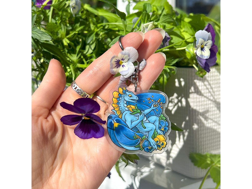 Originální klíčenka „Viola Garden“ s modrým drakem, který sází macešky. Ilustraci jsem vytvořila tradičními technikami. Přívěšek je vyrobený ze silného a kvalitního akrylátu, na který je vytištěný oboustranný motiv. Pečlivé lakování zajišťuje vysokou odolnost i při dlouhodobém používání. Klíčenku si můžete připnout na klíče nebo ji použít jako přívěšek na batoh, penál a spoustu dalších předmětů, které si chcete ozvláštnit.