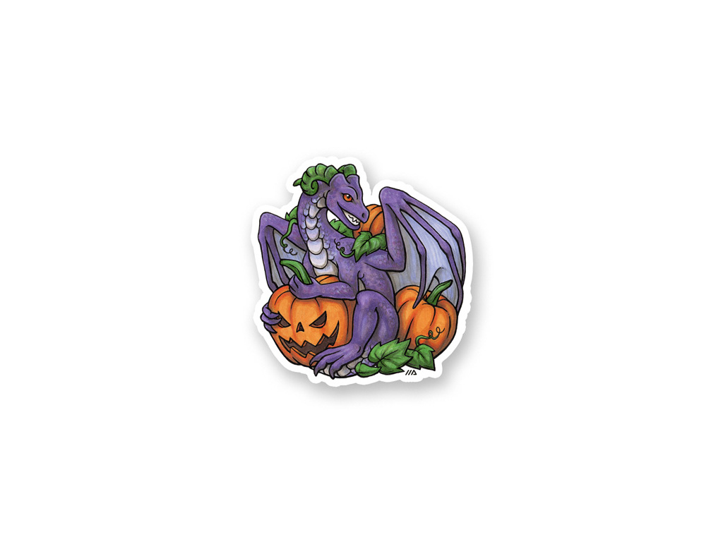 Originální nálepka "Pumpkin Harvest" s fialovým drakem, který sklízí dýně. Skvěle se hodí k podzimnímu svátku Halloween. Ilustraci jsem vytvořila tradičními technikami.