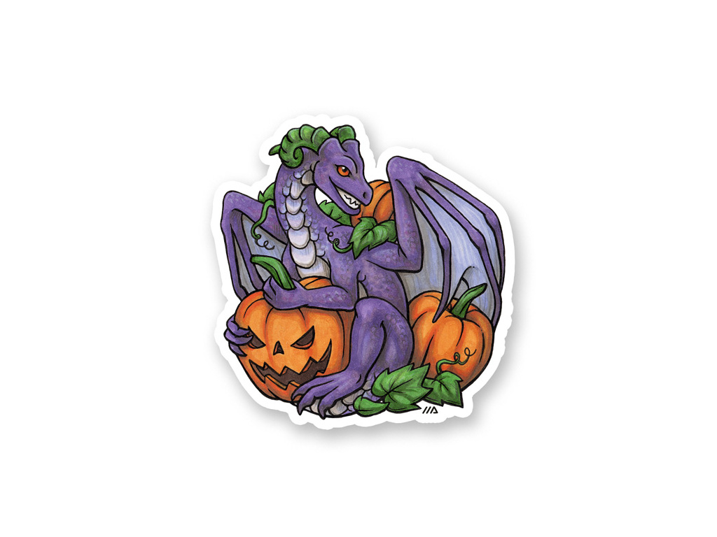 Originální nálepka "Pumpkin Harvest" s fialovým drakem, který sklízí dýně. Skvěle se hodí k podzimnímu svátku Halloween. Ilustraci jsem vytvořila tradičními technikami.