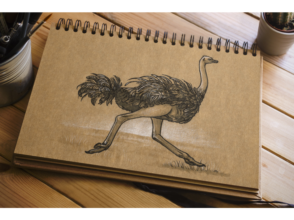 - Kresleno na hnědý, recyklovaný papír velikosti 147 x 210 mm pomocí tuše, Copic markerů a bílé pastelky.