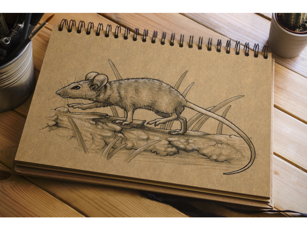 - Kresleno na hnědý, recyklovaný papír velikosti 147 x 210 mm pomocí tuše, Copic markerů a bílé pastelky.