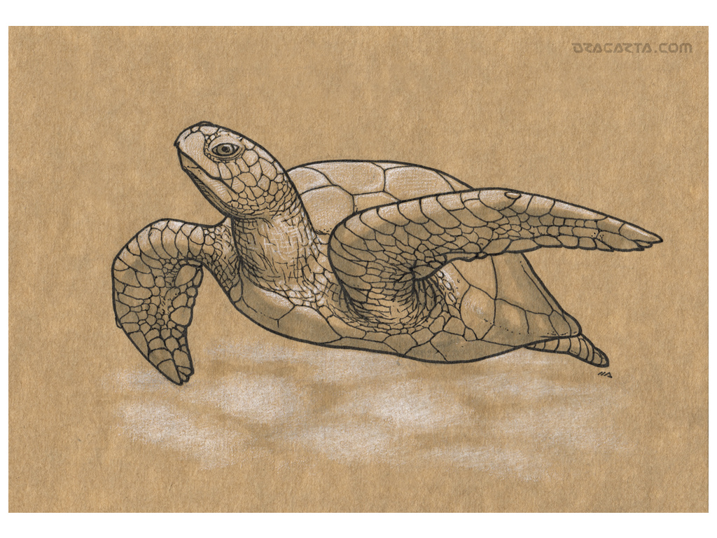 - Kresleno na hnědý, recyklovaný papír velikosti 147 x 210 mm pomocí tuše, Copic markerů a bílé pastelky.