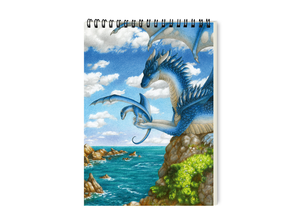Pro všechny tvořivé i psavé jsem připravila skicáky (zápisníky, skicáře, bloky chcete-li), které se skvěle hodí na črtání, kreslení, psaní poznámek nebo klidně i jako deník. Dračí skicák má formát A5 (148 × 210 mm) a velice příjemné krémové papíry. Vyzkoušela jsem, že se do něj moc dobře kreslí tužkou, pastelkami, linery i propiskou. Je prakticky svázaný černou kroužkovou vazbou a doplněn černou gumičkou, aby se jeho strany neotíraly o sebe, když ho třeba ponesete v batohu. Obálka je chráněná matným laminem a tvoří ji ilustrace „First Flight“.